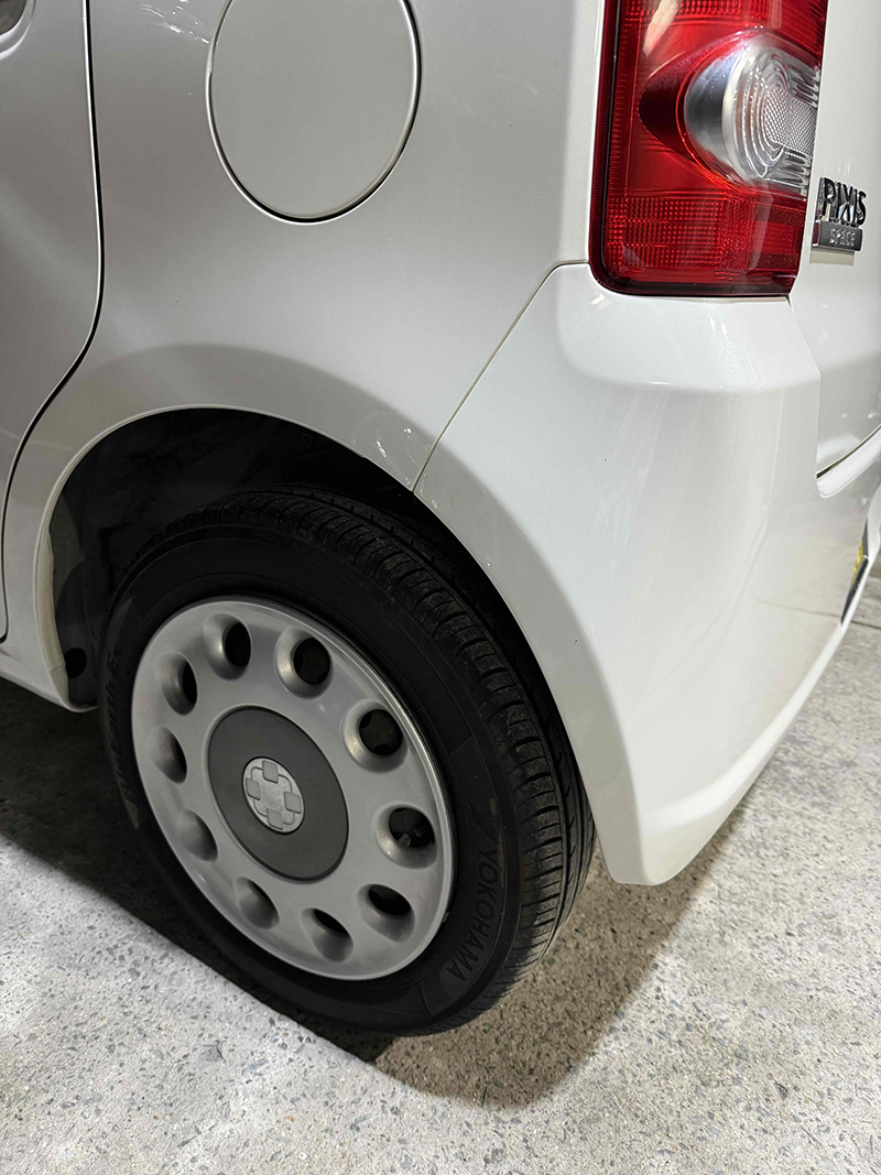 ピキシススペースのバンパー修理です。駐車場で当て逃げに遭った